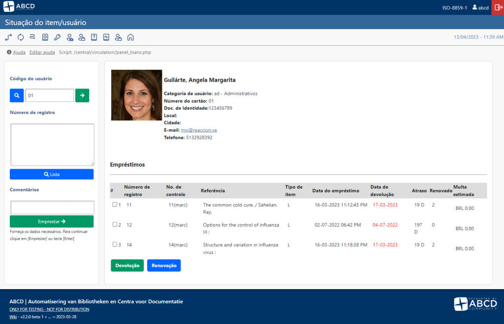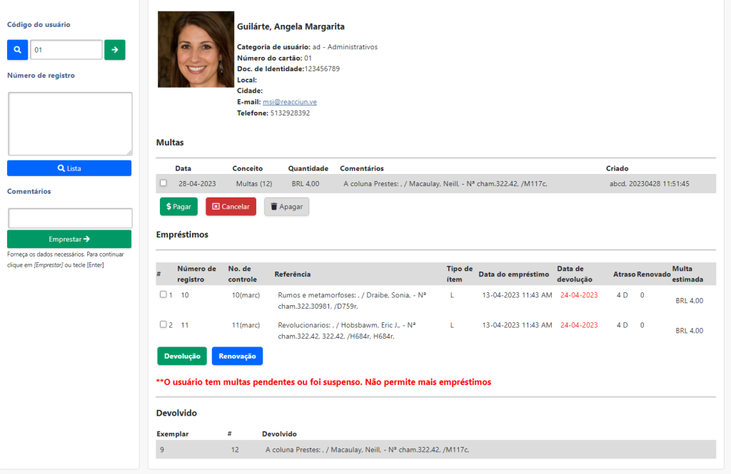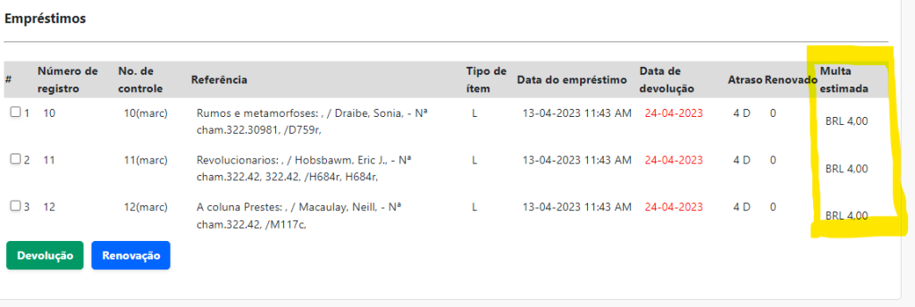 Outro detalhe no novo layout é a adição de uma nova coluna no tabela de itens emprestados que permite a visualização em tempo real da estimativa de multa. Isto permitirá que o funcionário da biblioteca tenha uma resposta rápida ao seu usuário.