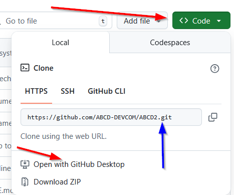 - Si tienes GitHub Desktop: puedes clonar el proyecto a través de Código -> Abrir con GitHub Desktop (las flechas rojas en la imagen)