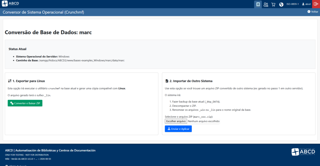 A migração de bases entre servidores Windows e Linux sempre foi um ponto de atenção devido à compatibilidade dos arquivos binários (.mst e .xrf). O novo utilitário Export/Import (db_convert_crunchmf.php) utiliza a ferramenta crunchmf do CISIS para automatizar essa conversão:
